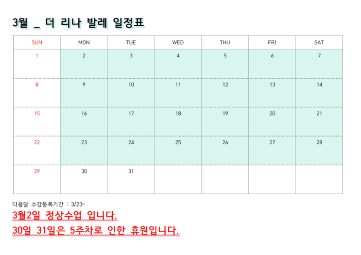 3월 수업 일정표 입니다. 하늘색으로 칠해져있는 부분이 수업 오시는 날 입니다. 3월2일 (월) 정상수업 입니다. 30일(월)31(화) 5주차로 인한 휴원입니다. 꼭 확인부탁드려요 ! 전화문의 010-3801-6277 카카오톡 the_rina_ballet . . . #therinaballetstudio #더리나발레스튜디오 #용인발레 #용인발레학원 #용인무용학원 #보정동발레 #용인보정동발레학원 #보정동발레학원 #기흥발레학원 #죽전발레학원 #분당발레학원 #용인필라테스 #용인전공입시 #발레전공 #발레입시 #유아발레 #초등발레 #성인발레 #발레핏 #보정초등학교 #유정유치원 #계원예중 #계원예고 #보정동카페거리 #용인맘 #분당맘 #죽전맘 #일상 #발레 #ballet <img src="https://blogthumb.pstatic.net/MjAyNjAyMjNfNyAg/MDAxNzcxODUzMDI0MTEx.FEv_Mx5rhhUjE5bSxWQwzzleJmc1JnRW7syv_IA0-PYg.AJBwEP2KpvKbZwRt9oxDKSFaIhRPCrM4eeDWveocv3cg.PNG/IMG%A3%DF0847.PNG?type=s3" />