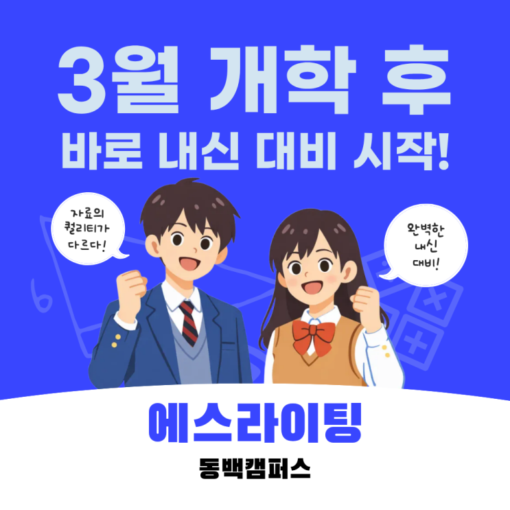 [고등부] 3월 새 학기, 개학과 동시에 내신 완벽 대비 체제 돌입! 안녕하세요, 에스라이팅 동백캠퍼스입니다. 고등부 학생들에게 가장 중요한 것은 바로 내신성적입니다. 에스라이팅 동백캠퍼스는 개학과 동시에 내신 대비 체제에 들어갑니다❗️ 2학기 기말고사 결과, 성적 급상승 학생 https://blog.naver.com/annie4353/224126584837 3월 새 학기 시작과 동시에 학교별 내신 대비 수업이 본격적으로 시작됩니다. 학교별로 반을 구성하여 각 학교의 진도와 특징에 맞춘 집중 학습을 진행합니다. 그동안 꾸준히 좋은 성적을 내온 비결은 바로 정교한 분석 자료에 있습니다. 각 학교의 역대 기출 스타일을 철저히 분석한 에스라이팅만의 자체....... <img src="https://blogthumb.pstatic.net/MjAyNjAyMDdfNTUg/MDAxNzcwNDU0ODMzNjc4.IiAtQKRJ08PYB61jWekfoGZSl6201gXVHbqcPH5ARF8g.ULkWSwWZYCMAeChRqEDvfYKryZ0tIjB4tMXGeaqH5Gwg.PNG/%BF%A1%BD%BA%B6%F3%C0%CC%C6%C3.png?type=s3" />