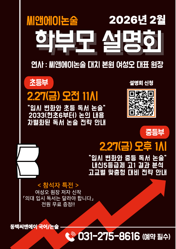 “2032 바뀌는 입시 제도에서 국어, 논술로 준비하는 우리 아이 학습 전략” 안녕하세요. 동백씨앤에이 논술, 국어 학원에서 2월 27일(금) 오전 11시(초등부)/ 오후 1시(중등부) 대치 본원 여성오 대표 원장님 초청 학부모 설명회에 초대합니다. 2032학년도 대입부터 수능·내신 절대평가? 지금의 초6부터 달라지는 입시 판도 입시 변화에 따른 초등과 중등의 차별화된 독서 논술 전략 꼭 신청하세요~!! 서울대·의대 합격생을 다수 배출한 C&A 대치 본원 여성오 대표 원장님을 모시고, 크게 변화하는 입시 제도의 핵심 정보는 물론, 미래형 사고력 교육의 방향과 내신·수능 실전 대비 전략까지 가장 구체적이고 현실적인 조언을 들을 수 있는....... <img src="https://blogthumb.pstatic.net/MjAyNjAyMTlfMjkg/MDAxNzcxNTExMTg4MDk3.uj5e8KMm6-pVUetYsfBqiwsUmO9YP66qN0cYPPex0ecg.uuNbx5EP1JaDAd86bKg2cWFiViiwENU135T49ynCYrQg.PNG/image.png?type=s3" />