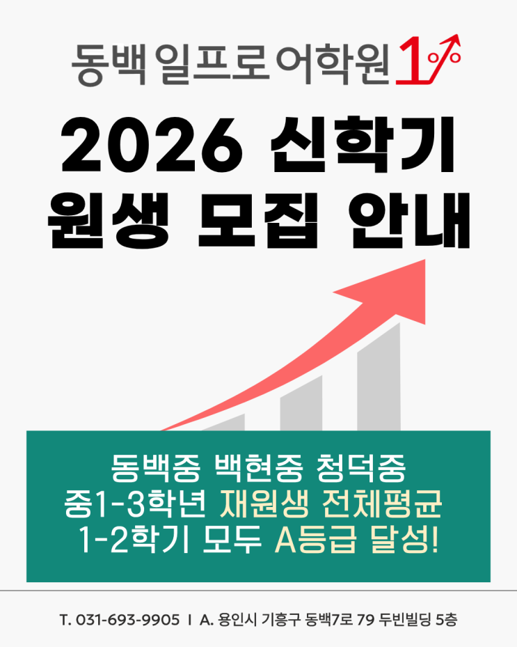 동백 영어학원 일프로 어학원 중학교 1-3학년 재원생 전체평균 A등급! 2026년 성적 향상의 주인공이 되세요.