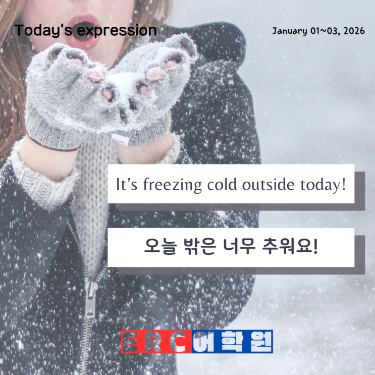 January 01-03, 2026 Today's Expressions 이번 달 주제: Winter - 계절 표현: 겨울 It’s freezing cold outside today! 오늘 밖은 너무 추워요! Proverb 이번 달 주제: Miscellaneous - 기타 All that glitters is not gold. 반짝이는 것이 모두 금은 아니다. Nothing in the world can take the place of persistence. Keep up studying. ERC어학원 경기도 용인시 수지구 만현로 110 원희캐슬 6층 내 꿈을 찾아가는 즐거운 공부~ 꼼꼼한 관리로 소문난 ERC어학원~ Phonics부터 중등을 넘어 수능까지 쭈~욱! #Today's #Expression #Proverb #상현동영어학원 #상현동어학원 #수지구영어 #상현초 #서원초 # 솔개초 #이현초 #심곡초 #서....... <img src="https://blogthumb.pstatic.net/MjAyNjAxMDVfMTE5/MDAxNzY3NTg4NDI5MjQ1.3AvhrI2h2odD-mIM9xj2eWXRs8H2yGrW-_AJAXhX-Ikg.LraI4syQAmE9kSCEtgCJJdhIv5fy80aciOGGCXktEpcg.PNG/0_TE_20260101.png?type=s3" />