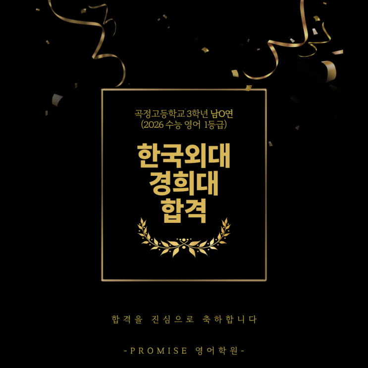 안녕하세요, 프라미스 자이 영어학원입니다. 입시 현장에서 아이들과 함께 호흡하다 보면, 유독 마음이 가고 그 성장이 눈부신 제자들이 있습니다. 오늘은 오랜 시간 저희 프라미스 자이 영어학원과 함께하며, 역대급 난이도라 불린 2026학년도 수능에서 당당히 영어 1등급을 성취하고, 한국외국어대학교, 경희대학교에 동시 합격의 결실을 거둔 곡정고등학교 3학년 남O연 학생을 소개합니다. 역대 최저 수준의 1등급 비율, 그 벽을 넘다 올해 수능 영어는 가히 '마그마 수능'이라 불릴 만큼 가혹했습니다. 전국 1등급 비율이 3%대 초반 에 머물 정도로 변별력이 높았고, 이는 전국 응시자가 약 48명에 달한다면, 그 중 1.5명만이 받을....... <img src="https://blogthumb.pstatic.net/MjAyNjAxMDZfMzIg/MDAxNzY3NzA4NTg5NDk2.bwaHc7T8U6NL8EwZZ1ZdnGbfMCANBjmnvSGAYIrVzBkg.6MI_M-o7AaqUegZfGDufAp1lBBt7XDH08UvKQHUN0_8g.PNG/%C1%A6%B8%F1%C0%BB_%C0%D4%B7%C2%C7%D8%C1%D6%BC%BC%BF%E4..png?type=s3" />