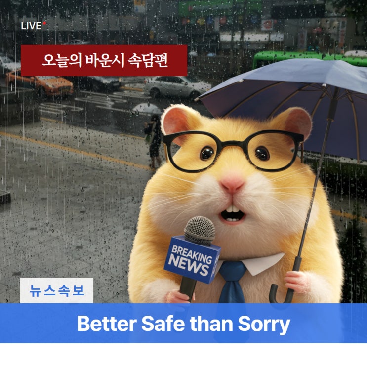 안녕하세요! 청담 에이프릴에서 만든 온라인영어 BOUNCY 입니다. “어… 우산 가져갈까? 안 올 것 같긴 한데…” 이런 고민, 다들 한 번쯤 해보셨죠? 결국 우산 안 챙기고 나왔다가 갑자기 소나기라도 쏟아지면 속상하잖아요. 이럴 때 딱 맞는 영어 표현이 있어요! "Better safe than sorry." “나중에 후회하느니, 지금 조심하는 게 낫다”는 뜻이에요. 누군가에게 조언하거나 스스로 경계할 때 자주 등장하는 속담이랍니다. 예문을 통해 더 자세히 알아볼까요? 예문1 A: Do I really have to wear my helmet? 꼭 헬멧을 써야 돼요? B: Yes, you do. 그래, 당연하지. A: But I'm just riding in the park! 하지만 그냥 공원에서....... <img src="https://blogthumb.pstatic.net/MjAyNTA4MDZfMjQg/MDAxNzU0NDY0OTM1OTQ1.JqHwCLlXMoG_HIukMtYjevqy1n7hxDS2pIRSRR2eTYog.PJQluJNh1rKjyEqPrMas1OBEghotUx7PLavxQ5RinSsg.JPEG/%C1%A6%B8%F1%C0%BB_%C0%D4%B7%C2%C7%CF%BC%BC%BF%E4.jpg?type=s3" />