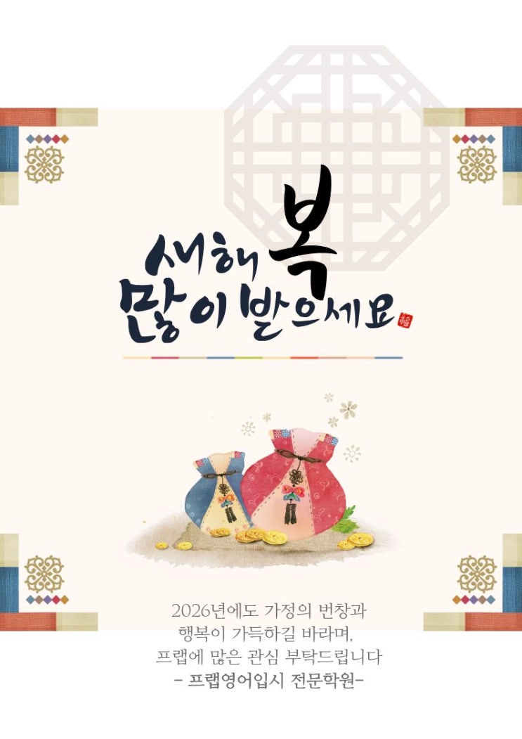 안녕하세요^^ 다음주는 설 명절이 있습니다. 새해 복 많이 받으시고, 2026년도에는 가정마다 평안이 깃드시길 바랍니다. 본 학원은 2월16~17(화) 명절로 인해 휴강을 합니다. 설 명절 즐겁게 보내시고, 더 열심히 2월을 보내겠습니다.^^ 감사합니다.^^ 즐거운 명절 되세요~~~ 교육문의 010.2336.0527 <img src="https://blogthumb.pstatic.net/MjAyNjAyMTRfOCAg/MDAxNzcxMDU1MDM1Njk2.PSbM-fkfw3MaZToxf0HPq-XNiEiWgsHQoNC4JqKVF_Ig.Lk6rdT40tQhpKgC91SDxOmR6B_R_kh7-ZTpslkBF70kg.JPEG/%C1%A6%B8%F1%C0%BB_%C0%D4%B7%C2%C7%D8%C1%D6%BC%BC%BF%E4._%2862%29.jpg?type=s3" />