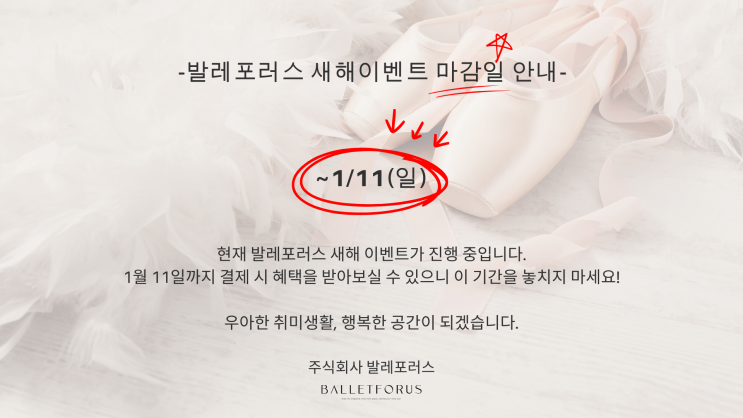 현재 발레포러스 새해 이벤트가 진행 중입니다. 1월 11일까지 결제 시 혜택을 받아보실 수 있으니 이 기간을 놓치지 마세요!! #발레클래스 #비기너발레 #성인발레 #바디라인 #취발러 #발레학원 #서울발레 #발레스타그램 #발레시작 #발레운동 #발레핏 #발레수업 #성인취미 #취미추천#스트레칭운동 #기초발레 #성인취미생활 #다이어트 #새해 #새해이벤트 #유아발레 #초등발레 #키즈발레 #발레포러스마포공덕점 #발레포러스한남옥수점 #발레포러스송파석촌점 #우아한취미생활_발레포러스 <img src="https://blogthumb.pstatic.net/MjAyNjAxMDhfMTA3/MDAxNzY3ODQwOTI5NDc1.OJXjESIYz-Ip2f8eh9IdqZCwMvAjMllA3EpPShirvB0g.pl8jFnxcLVRr88QQlLRrDzBHJLyr0PbyKwrsp4bP9HMg.PNG/%BB%F5%C7%D8%C0%CC%BA%A5%C6%AE_%B8%B6%B0%A8%C0%CF.png?type=s3" />