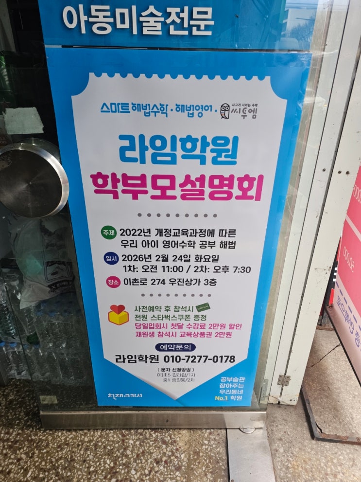 안녕하세요! 공부 습관 잡아주는 우리 동네 No.1 학원!! 이촌동 라임학원과 함께하는 스마트 해법 서울중부지사입니다!! 지난 2월 24일 화요일 용산구 이촌동에 위치한 라임학원에서 뜨거운 관심 속에 학부모 설명회가 개최되었습니다. 우리 아이들의 변화된 교육 과정에 맞춘 학습 전략을 공유했던 그 현장의 열기를 전해드립니다! 일시 : 1차 02월 24일 (화) 오전 11시 2차 02월 24일 (화) 오후 7시 30분 장소 : 이촌 라임 학원 강사 : (수학) 본사 수학 교육팀 오성아 강사님 (영어) 중서부 지사 지사장 2022 개정 교육과정, 완벽 대비의 시작 이번 설명회는 '2022 개정 교육과정에 따른 우리 아이 영어·수학 공부 해법'이라는....... <img src="https://blogthumb.pstatic.net/MjAyNjAyMjVfNDYg/MDAxNzcxOTk5ODUyNTYy.nTBL44E-2G9_WLuKmpbO5MqxVG1kKy4GSE9n3_Y1VlUg.Oybdr9wGq-i_9ZoPMtsK2L4l0jMhA9fNEvcBsEuBHe8g.JPEG/900%A3%DF1771992778643.jpg?type=s3" />