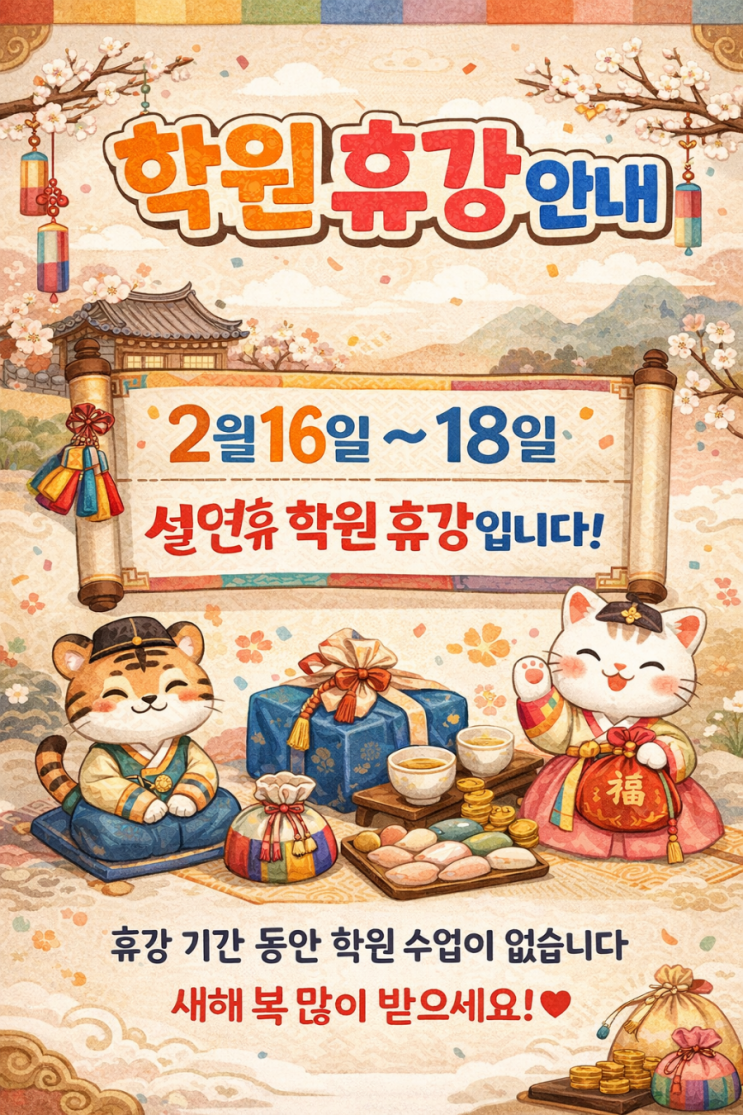 안녕하세요. 고촌 수학전문 수학의 고수입니다. 다음주는 2026년 설 명절입니다. 우리 고촌 수학의 고수 학생들에게는 정말로 소중한 시간이 될거라 생각합니다. 자주 만나지 못했던 할아버지 할머니, 가까이 있지만 서로 바빠서 서로의 안부도 묻는게 어려웠던 삼촌, 이모 그리고 사촌들까지.. '설'이라는 소중한 날을 벗삼아 한동안 소홀했던 시간들 이번 설 연휴를 통해 가족, 그리고 친지, 이웃등과의 소중함을 느끼고 배울 수 있는 정말 뜻깊은 시간이 되길 바라며. 그래서 이번 설 연휴기간 동안 숙제는 "가족과의 소중한 만남"으로 대체하겠습니다 다만, 금토일은 설연휴가 아니기에 주말숙제는 배부되오니 참고해주....... <img src="https://blogthumb.pstatic.net/MjAyNjAyMTNfMTMw/MDAxNzcwOTU4NTYwNTE1.1hloauvbXWCrRmrWmzc1oxVOoAVnNUS4pPK6qgCgT48g.ty5EHwP8oYqO-F2xn_BkXCQMXIKv4mxFN34t2RTwtO8g.PNG/900%A3%DFfile%A3%DF0000000067c471f899c7a2ec02aa022c.png?type=s3" />