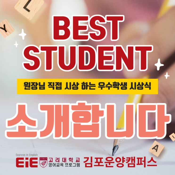 안녕하세요 EiE고려대학교 국제어학원 운양캠퍼스 입니다. ^^ 1월 시상하는 날이 왔습니다. EiE고려대학교 국제어학원 운양캠퍼스에서는 매달 1권의 책을 끝내는날에 Monthly Test 보는데요~ 시험은 Listening, Reading, Speaking, Writing 4가지 영역으로 나누어져 있어 영역별 점수를 통해 학생들의 부족한 부분을 정확하게 파악할 수 있어요. Online 수업을 포함하여 가장 우수한 학생을 각 레벨별로 선정하였는데요 어떤 학생들이 상장을 받았는지 살펴보아요~ ★Best Student★ Belle 학생은 LS5 중 1월 월말 테스트에서 가장 우수한 성적을 내어 상장과 EiE sticker를 시상합니다~~!! 한현숙 원장 ★Best Presenter★ Dawon 학생은 학원에....... <img src="https://blogthumb.pstatic.net/MjAyNjAyMDZfMTcg/MDAxNzcwMzY1OTAxNjc5.AUWunjQkF9RYOsJxjgNy6eFBYaYq26tqJyyl1oxWIIQg.-A9l2u5POO24guYc1ZXKJWK6wiV0zDO-NKqv4babrtEg.PNG/fadfafasdfsadf.png?type=s3" />
