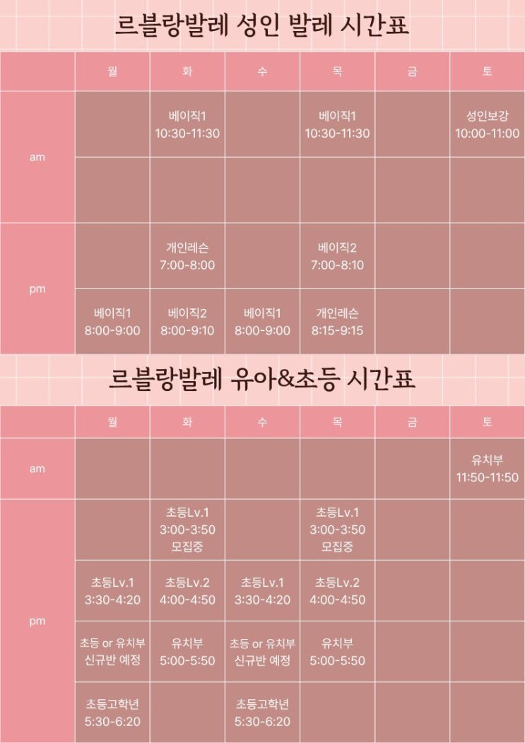 안녕하세요 르블랑발레입니다! 성인발레, 유아&초등 시간표 입니다 ♥ 상담전에 미리 시간표 확인 부탁 드립니다!! 대면상담 및 체험수업은 네이버로 예약 해주세요:) ◆월·수 3시 30분 초등 저학년반은 정원 마감 되었으며 4시 30분 반은 상담 인원에 따라 최종 반 편성이 결정될 예정입니다. ◆화목 오전 11시 30분 or 월수 10시 30분 대기신청 받고 있습니다. *신규는 상시등록 가능하며 선착순으로 정원 마감됩니다. *시간표 외 수업은 수강인원이 3명 이상일경우 원하시는 시간에 수업개설 가능합니다. *본 시간표는 본원 사정에 따라 변동될 수 있음을 알려드립니다. 상담 및 문의 010-4518-7829 카카오톡 ID leblanc_ballet 카카오채....... <img src="https://blogthumb.pstatic.net/MjAyNjAyMTJfMjY4/MDAxNzcwODg4NDQ0MDkz.RoxvUOf9hpt7W7dQ9fwl_hjWtHEQUaBOdJavCMG5S84g.u-wKxyXdB1vB11VcZFTv_O1qqnMfs4DGRso_StWdg98g.JPEG/%C1%A6%B8%F1%C0%BB_%C0%D4%B7%C2%C7%D8%C1%D6%BC%BC%BF%E4._%2820%29.jpg?type=s3" />