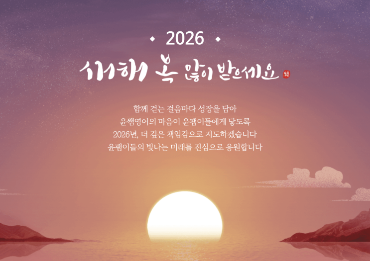 안녕하세요, 윤팸들을 진심으로 아끼는 윤쌤 영어입니다. 어느덧 2026년 새해와 함께 민족 대명절인 설날이 다가왔습니다. 지난 한 해 동안 저희 윤쌤영어를 믿고 소중한 아이를 맡겨주신 학부모님들께 깊은 감사의 인사를 올립니다. "단 한 명의 학생도 소홀함 없이, 윤쌤영어의 정성으로 실력을 완성하겠습니다." 올 한 해도 아이들이 영어라는 파도를 자신 있게 넘을 수 있도록, 단순히 지식을 전달하는 것을 넘어 아이들의 꿈에 진심을 다하는 든든한 조력자가 되겠습니다. 김포에서 가장 따뜻하고 실력 있는 교육 파트너가 될 것을 약속드립니다. 설 연휴를 맞아 아래와 같이 학원 수업 일정을 안내해 드립니다. 설 연휴 휴강 안....... <img src="https://blogthumb.pstatic.net/MjAyNjAyMTNfMjc1/MDAxNzcwOTc5NjU1OTg3.JDeJFKaL933YLUwv5bQt10bTK5o9FxQJ3mgtyJz4E6Eg.zhpm4XCDFr7JmFT6jg0ZaqEjNjHI2ELdIIRRzkB4GlEg.PNG/%C1%A6%B8%F1%C0%BB_%C0%D4%B7%C2%C7%D8%C1%D6%BC%BC%BF%E4..png?type=s3" />