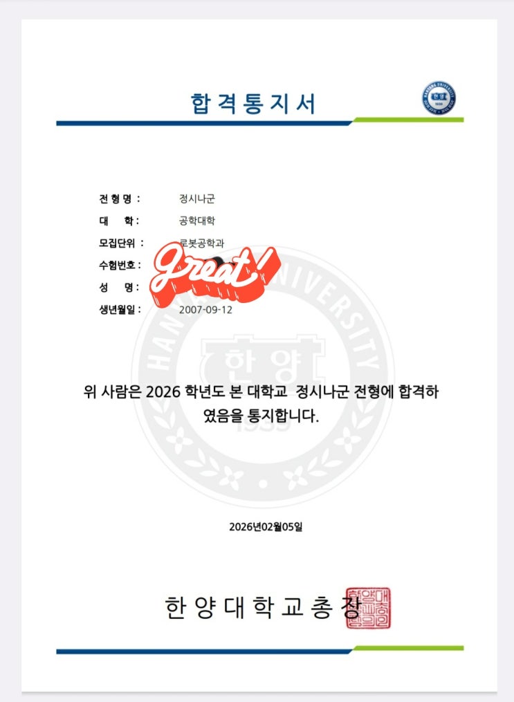 2026년 한양대 입학한 풍무고3학년 재원생 후기