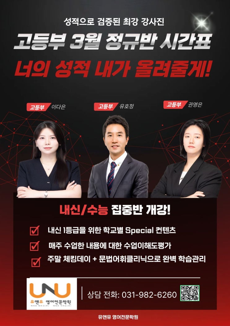 김포 장기동 고등영어학원, 유앤유 영어전문학원 2026년 고등부 3월 신학기 정규반 시간표