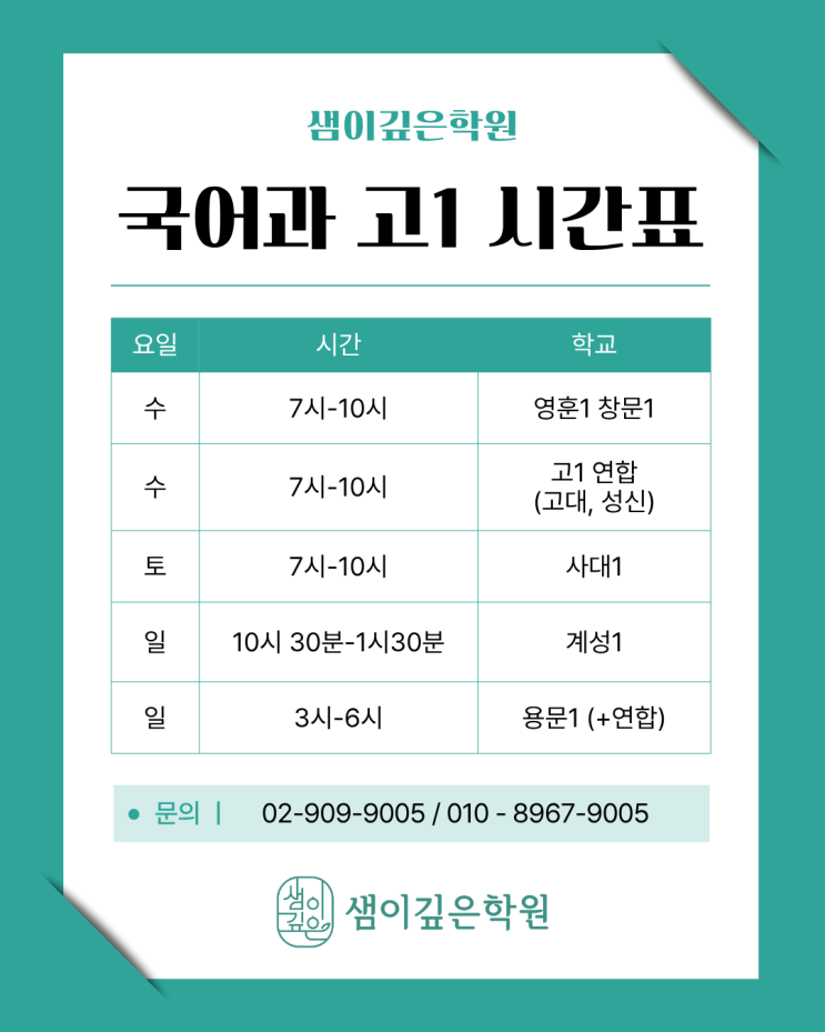 성북구 국어, 수학 학원 샘이깊은학원 고1 국어과 시간표 안내