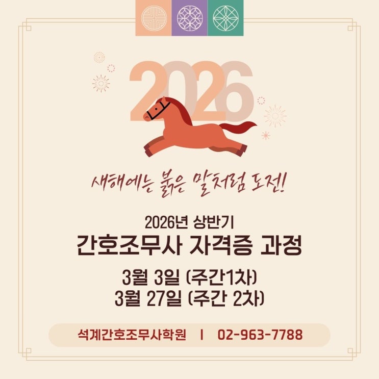 안녕하세요 석계간호조무사학원입니다! 많은분들이 기다리시던 소식! 상반기 간호조무사 과정 주간반에 대해서 알려드립니다! 2026 상반기 간호조무사 자격취득반 모집중 개강일: 3월 3일 (주간1차) 석계간호조무사학원은 훈련생분들의 자격증 취득과 취업을 위해 최선을 다하고 있습니다! 이번 학기에 등록하시면 2027년 상반기에 있을 간호조무사 국가시험에 응시할 수 있게 되며, 모든 훈련생이 시험에 잘 준비될 수 있도록 커리큘렴을 짜놓았으니 주저마시고 도전하세요! 봄학기 개강일 (주간1차) 2026년 3월 3일 3월 3일에 개강하는 반은 [이론 1차 - 실습 - 이론 2차] 순으로 준비를 하게됩니다. 일정은 다음과 같습니다 2026 상반기 봄학....... <img src="https://blogthumb.pstatic.net/MjAyNjAyMjNfMTM4/MDAxNzcxODAzMzk3MjM2.SR2YHeHAmChKGWaLOJf2Agm6zBwaQ4x90itOhZHlqmAg.NgoivbtjCygVS1FxSLpFVrUvxbWP4pnwXgbfsdpkd6Ig.JPEG/2.jpg?type=s3" />