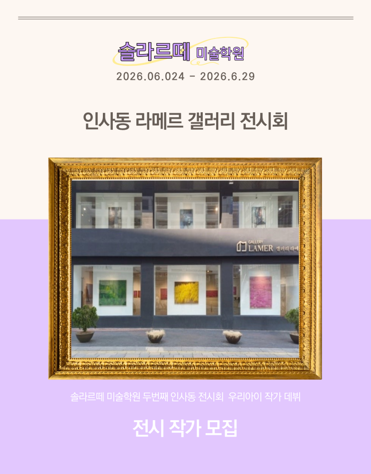 25년, 솔라르떼의 첫 번째 인사동 공동 전시회 작년 인사동 조형갤러리에서 첫 작품 전시 인사동 대표 전시 공간에서 만나다 2026년, 15개원 공동 기획전 《예술로 함께 피어나다》 2026년 6월 24일 – 6월 29일 인사동 라메르 갤러리에서 아이들의 작품이 전시됩니다 《예술로 함께 피어나다》 아이들은 같은 시간을 살아가지만 각자 다른 속도로 자랍니다. 이번 전시는 그 ‘지금’을 담아내는 작업입니다. 완성도보다 아이의 시선과 생각, 그리고 과정에 집중합니다. 성장, 변화, 시작, 현재의 나. 각자의 해석 속에서 아이들은 저마다의 방식으로 피어납니다. 전시 참여비 안내 이번 인사동 라메르 전시는 단순 작품 발....... <img src="https://blogthumb.pstatic.net/MjAyNjAyMjNfMjk1/MDAxNzcxODUzMzI0NTgz.vZE2f7ozPnyULD7DKSAafgr4hLf80NolLaM6jSvzH48g.tsm9ZQkhsE-mFjaxEC8_iM3_cSXZArbuh196UW90gosg.PNG/%C0%FC%BD%C3%B8%F0%C1%FD%BE%C8%B3%BB%B9%AE_%281%29.png?type=s3" />