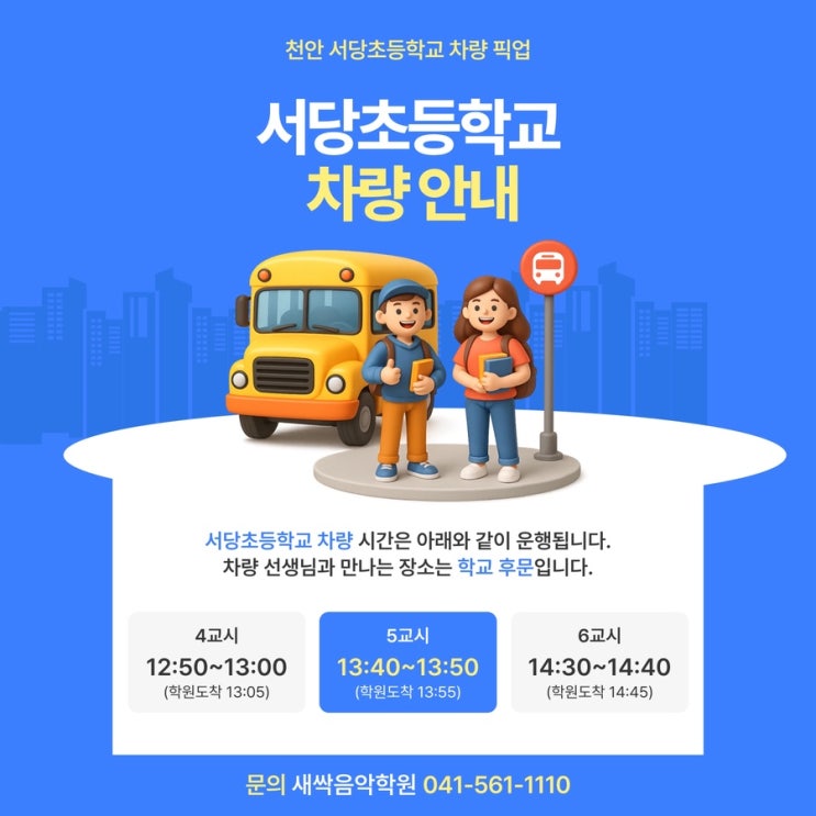 천안 서당초등학교 차량 안내 안녕하세요, 새싹음악학원입니다. 픽업 차량은 4/5/6교시 하원시간에 맞춰 운행되고 있습니다. 새싹음악학원 수업을 마치고 집이나 다른 학원에 도착하는 시간은 학원도착 시간으로부터 최소 60분이상 생각해주시면 됩니다. 하원차량은 집/다른학원으로 드랍 가능합니다. ✨상담안내✨ 이름/나이/피아노/차량유무/등원요일 ☎️ 041-561-1110 ✉️ 010-4896-0201 #천안서당초등학교 #서당초등학교 #와이시티아파트 #대원칸타빌아파트 #꿈에그린아파트 #한성필하우스아파트 #불당동피아노학원 #불당동음악학원 #서당초피아노 #서당초바이올린 #서당초차량운행 <img src="https://blogthumb.pstatic.net/MjAyNjAyMTNfMjkz/MDAxNzcwOTY3MjgwNTk1.86ykTwnm3sTxZ4-cLXHIG1y_3cRaFmQgjcOST94YqxEg.Wk_wCh6TipQvsmJZgSBc71VOB5Cld58DN3zLbq2YfAQg.JPEG/IMG%A3%DF4768.JPG?type=s3" />