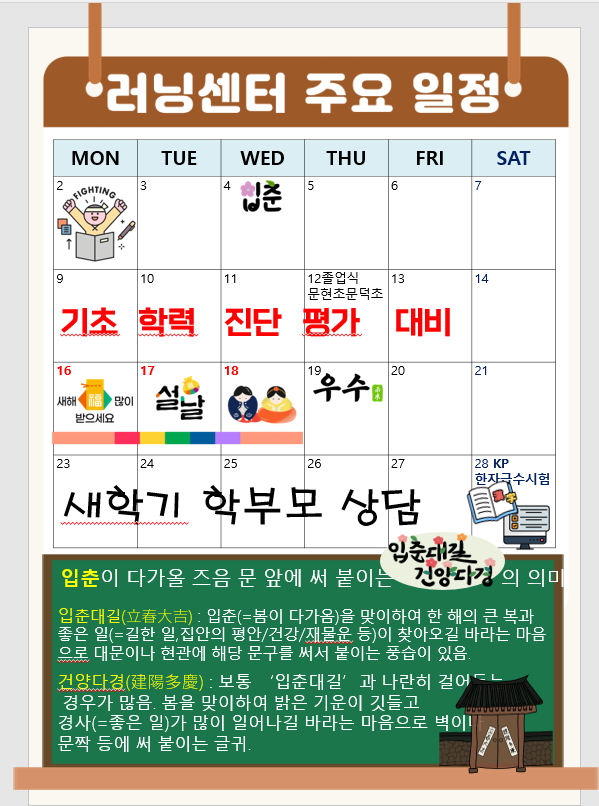 2월은 초등학교 졸업식과 설 명절이 있어요. 더불어 2월은 새학년 준비기간 이에요. 3월에 전국적으로 시행하는 기초학력평가대비는 필수에요. 기초학력평가보고 담당 선생님과 학습 상담은 필수에요. 기초학력평가 진단에서 부족한 과목 영역을 찾아 빠르게 해결해야 새학년 학습을 즐겁게 할 수 있어요. <img src="https://blogthumb.pstatic.net/MjAyNjAxMjdfMTIx/MDAxNzY5NDg5MDkxMTUy.lk08jTokcaPiFNzcawOQ1dlatmn2FUKGF7ZY-Rvi-2Ag.w-HWXkoxaxhkL_GULFXoYxC5JwOSQV0A-2DXHlCdmvQg.PNG/20260127_134005.png?type=s3" />