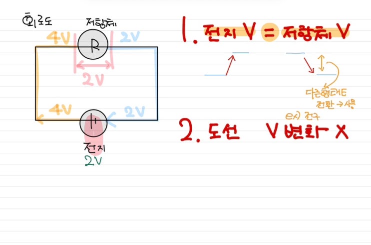 이번시간에는 저항의 연결에 대해 알아볼께요. 저항의 연결을 하기 위해서는 먼저 공식 2개를 알아주셔야 해요. V=I*R(옴의 법칙) P=VI(소비전력공식) 이것을 안다는 조건으로 설명해 드릴께요.. 꼬!~~~~~옥~~~~ 암기하기요^^ 회로도에서 전지에 걸리는 전압이 있습니다. 이는 전위차를 올려주는 것이지요. 저항체에 걸리는 전압이 있습니다. 이는 전위차를 내려주는 것이지요. 내려간 전위차는 다른 형태의 에너지로 전환되어 사용하게 된답니다. 예를 들어서 전구라는 저항체가 있다고 할때 낮아진 전위만큼 빛이라는 형태의 에너지로 전환되는 거랍니다. 그렇기에 전지의 전위차 = 저항체의 전위차 같아야 해요. 두번째로는 도....... <img src="https://blogthumb.pstatic.net/MjAyNjAyMDRfMjM1/MDAxNzcwMTc2NzA3NDky.QfAinZu75ChB5kfP69TqEzNlg4VPZSxsF0khHU5wKPEg.tHKMUKsjM4pKgPsp0Tl63UPr04S8Z71sMQpsQPhuE1cg.JPEG/IMG%A3%DF9483.jpg?type=s3" />