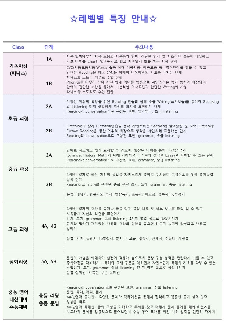 영어 실력, ‘단계별 성장’이 가장 중요합니다 20년 영어학원 원장이 직접 설계한 레벨별 커리큘럼 안내 영어는 속도가 아니라 방향입니다. 아이의 수준을 정확히 진단하고, 그 단계에 맞는 학습을 차근차근 쌓아갈 때 비로소 말하고, 이해하고, 생각하는 영어가 완성됩니다. 저희 학원은 지난 20년간 - 아이 한 명, 한 명의 성장 속도를 존중하며 - 무리한 선행이 아닌 레벨별 맞춤 수업으로 영어의 기초부터 심화까지 탄탄하게 지도해 왔습니다. 아래는 학원에서 운영 중인 레벨별 특징 안내입니다. 기초과정 (파닉스) 1A 단계 알파벳과 자음·모음의 기본 음가 인지 Chant, 영어 인사, 기초 질문 표현 CVC 단어 습득 및 이중자음 이....... <img src="https://blogthumb.pstatic.net/MjAyNjAyMDJfMTI0/MDAxNzcwMDM2MTk4MzEw.7NWAMKmVCDdAngLNZEo8XHbBC44OPiJD5ev8ltIb41gg.RGILO_WHysh9YfMlL7I1wPh_84QBjk-syn6tzENbESEg.JPEG/%BF%B5%BE%EE_%B7%B9%BA%A7%BA%B0_%C6%AF%C2%A1.jpg?type=s3" />