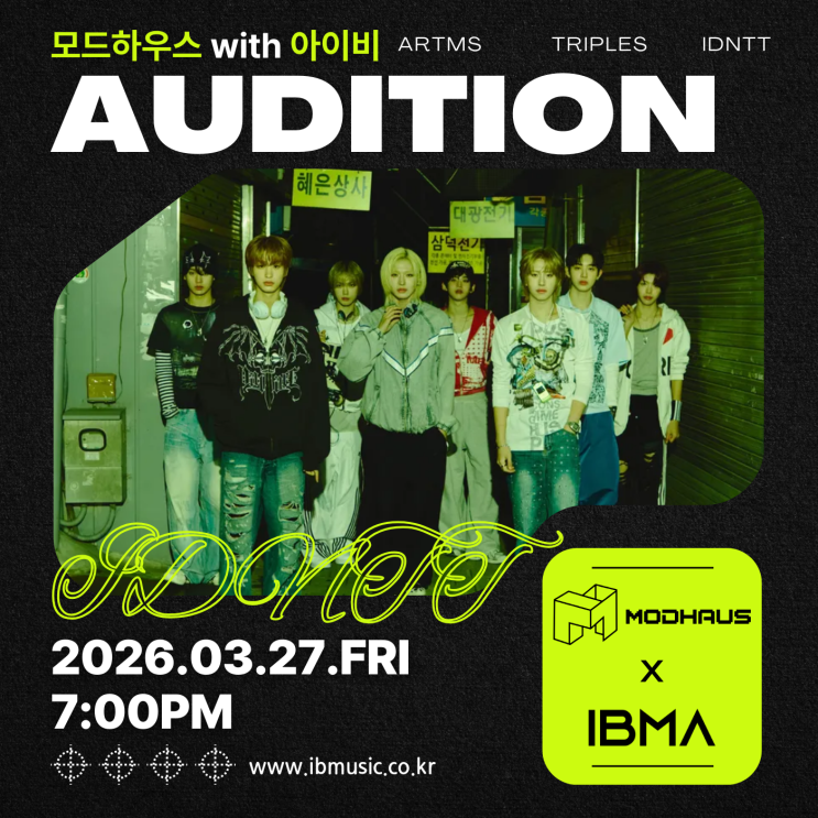 ⭐️ [ 모드하우스 오디션 공지 ] 2026년 03월 27일 (금) 오후 7시 00분 IBMA 강동캠퍼스 단독 진행! 안녕하세요! 서울 강동구 굽은다리역 2번 출구 도보 2분 거리, [서울/강동 오디션학원] 아이비뮤직아카데미 강동캠퍼스입니다. 이번 03월 27일, 아이비뮤직아카데미 강동캠퍼스에서 아르테미스, 트리플에스, 아이덴티티 등이 속한 모드하우스 오디션이 열립니다! 오디션 정보 안내 일정 : 2026년 03월 27일 (금) 시간 : 오후 7:00 장소 : 아이비뮤직아카데미 강동캠퍼스 ✅ 지원 자격 보컬 / 댄스 / 랩 부문 (택 2) 2006년생 이후 출생자 아이비 학생들은 이런 기회를 얻어요! IBMA 재학생 및 오디션 클래스 수강생 우선 참여 V....... <img src="https://blogthumb.pstatic.net/MjAyNjAzMTNfMjgx/MDAxNzczMzkxNTc3OTkz.v8YPolx8JZLxpI0UsPRytNnQeYJ8LgMXMZtYZYo27OMg.GB7PwPCm5nLT9FBRprc62WK22216Tn-CrKBDwEEoPA4g.PNG/%BF%C0%B5%F0%BC%C7%C6%F7%BD%BA%C5%CD_%286%29.png?type=s3" />