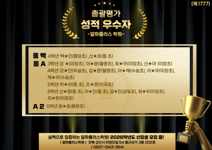 안녕하세요? 2025 알파플러스 총괄평가 성적 우수자를 소개합니다 ! 2025년 한 해 동안 성실하게 학습에 임해 준 우리 학원 학생들의 값진 성과를 전하게 되어 매우 뜻깊습니다. 이번 2025년도 총괄평가를 통해 우리 학원은 다시 한 번 체계적인 수업 운영과 학생 맞춤형 관리가 실제 성적 향상으로 이어지고 있음을 확인할 수 있었습니다. 총괄평가는 단기간의 암기나 요행으로는 결코 좋은 결과를 얻을 수 없는 시험입니다. 그동안 배운 내용을 얼마나 정확하게 이해했는지, 개념을 문제에 적용할 수 있는지, 그리고 학습 태도와 누적된 실력이 얼마나 탄탄한지를 종합적으로 보여주는 평가이기 때문입니다. 그런 점에서 이번....... <img src="https://blogthumb.pstatic.net/MjAyNjAxMDlfMTU5/MDAxNzY3OTMyNDE2MjY3.Zu5vE8O4QK8UR1cDwhCKgsC47GexfoWNEGgDODgmL_Qg.C2W8I-eoyni40JJnMOnGjoUpVwHgPd5OtSJzCLstJbMg.PNG/IMG%A3%DF2546.PNG?type=s3" />