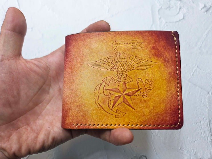 안녕하세요, 멋진 가죽공방 레더오브레전드 가죽공에 기술연구소 가죽학원 입니다. (Leather Of Legend Atelier) 오늘 선보일 작품은, 아버님께서, 전역을 앞둔 사랑하는 아들에게 멋진 선물을 남기고 싶어, 의뢰한 작품입니다. 이름하여 해병대 지갑인데요, 과연 어떤 포스와, 멋을 가졌는지 한번 살펴보도록 하겠습니다. "정의와 자유를 위하여"라는 문구가 정확하게 지갑의 전면에 각인되어 있으며, 황동 동판을 이용한 수동 프레스 작업으로 마무리되어 기계가 표현하는 딱딱한 그 무엇의 느낌을 넘어서 아주 자연스럽고도 강렬한 그런 느낌의 음양각이 주요 매력포인트라 할수 있겠습니다. 해병대 지갑의 기본 배색은 연 브라운과....... <img src="https://blogthumb.pstatic.net/MjAyNTEyMTdfMTc2/MDAxNzY1OTQxOTE4NjIy.xkqwNxw_W1gVi-VvBY2aUG9jvhukWjsKXlxAioy4spQg.7eVB_VHXuTCZRh-sFPi-NjJo9PBadApeBXs3MCkaiY8g.JPEG/20251128_165526.jpg?type=s3" />
