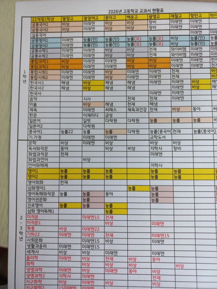 2026년 용강중2, 광양고2, 광양여고2 바뀌는 교과서 참고