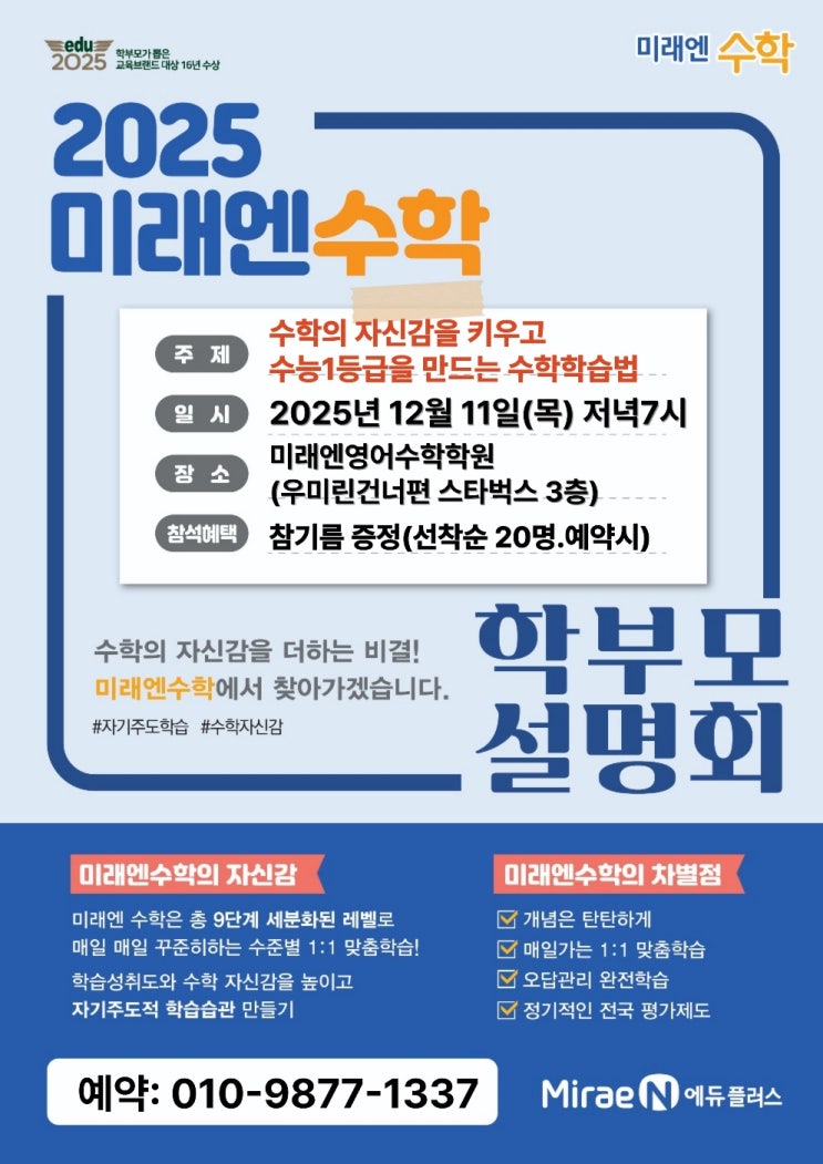 안녕하세요, 미래엔수학 윤정쌤입니다^^ 우리아이 수학학습에 도움이 될 학부모설명회가 오룡희망캠퍼스에서 이번 주 목요일 저녁 7시에 진행됩니다. 미래엔 본사에서 직접 오신 강사분께서 우리 아이의 수학 학습이 어떻게 달라져야 하는지, 그리고 미래엔 수학이 어떤 방식으로 아이들의 사고력·개념력·문제해결력을 설계해 가는지 약 40분간 깊이 있는 설명회를 진행합니다. 단순히 문제 다량 풀이가 아니라 아이의 사고 구조를 바꾸는 수학, 성장을 설계하는 커리큘럼, 학부모도 이해할 수 있는 미래형 학습 로드맵이 필요한 때입니다. 이번 설명회는 바로 그 부분을 정확하게 짚어드릴 예정입니다. ■ 참석하신 부모님께 드리는 작은 감사 이....... <img src="https://blogthumb.pstatic.net/MjAyNTEyMDlfMTc1/MDAxNzY1MjY0NTY4MTA1.FOx168v19wdlFgVYMJY5-r6ayfNPozOUOEmoQsP0j8sg.efd3ggfBrOsMm8XJdudy9VMgfLsn90A1ol8ADmWQiE8g.JPEG/KakaoTalk_20251209_144755097.jpg?type=s3" />