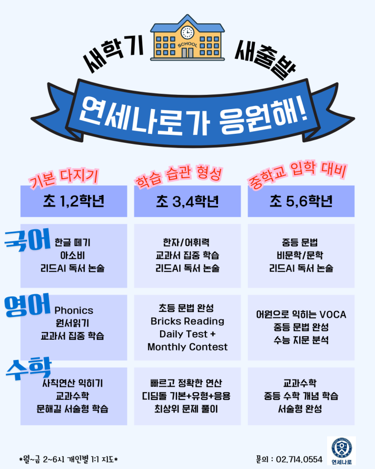 안녕하세요? 진심을 다하는 연세나로학원입니다. 2026년 3월, 새 학기를 새 마음으로 활기차게 시작해 보려 합니다. 초등학생의 경우, 영수를 매일 공부하면서 국어 수업을 주1~2회 추가하는 것을 추천해 드립니다. 이 시기에는 더 많이, 더 오래 공부하는 것보다 꾸준히 성실히 공부하는 습관 이 중요하기 때문입니다. 중학생은 한 번 학원을 오면 2~3시간 수업을 진행하므로 월수금에는 수학, 화목토에는 영어로 나누어 긴 시간 집중하는 연습하는 방식을 추천해 드립니다. 고등학생은 오히려 매일 학원을 가기 보다는 자신에게 부족한 부분을 집중해서 수업해야 하기에 매일 학원 가는 방식의 수업은 중학교까지 마치면 좋을 것 같습니다. 고....... <img src="https://blogthumb.pstatic.net/MjAyNjAyMTlfMjQ5/MDAxNzcxNDc4MjQ2OTcz.xg89UQLtSuz10sbIroMRxW7rHGUAV_gUacJkL5QxwXYg.KwkP8vBQZVwfweF9Wi0t-wtl8-gvNa5OXlDEN8tWbs0g.PNG/KakaoTalk_20260207_164357495.png?type=s3" />