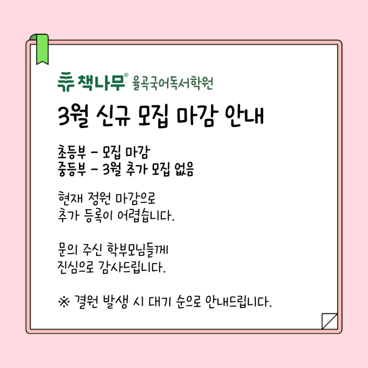 책나무 3월 신규 모집 마감 안내 김천 율곡동 국어 독서 논술 학원