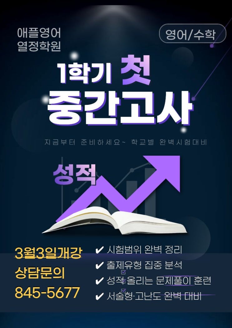 1-2월 1학기 개념정리 3월부터 응용심화학습이 시작됩니다~~ 아직 개념이 부족하다고요? 걱정 No No~ 지금부터 다시 개념정리는 기본이죠~~ 중간고사, 지금 시작하면 결과가 달라집니다! ✔ 시험범위 완벽 정리 ✔ 출제유형 집중 분석 ✔ 성적 올리는 문제풀이 훈련 ✔ 서술형·고난도 완벽 대비 단기간 성적 상승 프로젝트 OPEN “공부는 했는데 점수가 안 나온다?” 이제는 전략으로 점수 올릴 때! 목표 점수 달성 맞춤 관리 약점 집중 보완 시스템 실전 모의테스트 진행 지금 시작하면 이번 시험이 달라집니다. 중간고사 역전의 기회, 절대 놓치지 마세요~ 상담전화 02-845- 5677 입학상담신청링크https://m.sit....... <img src="https://blogthumb.pstatic.net/MjAyNjAyMjNfNjgg/MDAxNzcxODA4MTU1Nzc3.PBh5-IR1v4R4z7YQIDe04SRQcyKFuJZbpK2OpWtc8HQg.IkaZHD1DUzXMj9fJhKpmNBQ2zePj6sll-m0BJa-f7Uwg.JPEG/%C1%DF%B0%ED%BB%FD%C8%AB%BA%B8-%C1%DF%B0%A3%B0%ED%BB%E7_%282%29.jpg?type=s3" />