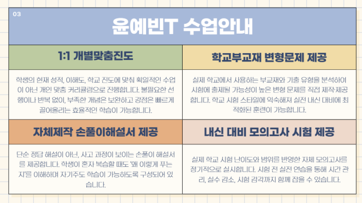 HELLOMATH 윤예빈T 고등학교 1학년 수학은 단순한 입문 과정이 아닙니다. 공통수학1에서 형성되는 개념 이해도는 고2·고3 성적과 직결됩니다. 특히 다항식, 방정식, 함수 기초, 경우의 수와 확률은 이후 전 범위의 기반이 되는 핵심 단원입니다. HELLOMATH는 “개념 이해 → 학교 시험 적응 → 실전 점수 완성” 3단계 구조로 수업을 운영합니다. ■ 수업 운영 방식 1. 1:1 개별 맞춤 진도 관리 • 사전 진단을 통한 현재 수준 분석 • 개인별 취약 단원 집중 보완 • 이해도에 따른 진도 조절 • 반복 학습이 필요한 학생은 별도 관리 획일적인 진도가 아닌, 학생별 맞춤 학습 설계를 진행합니다. ⸻ 2. 학교 교과서 기반 변형문제 제공 학교 시....... <img src="https://blogthumb.pstatic.net/MjAyNjAyMjNfMTEz/MDAxNzcxODIzMTUwODUx.kRJACnUywLZPdYBFFvUMDDcDslUNgwNJZyqqXWWdZcgg.wP9N7isscPg30q9OcaHU-26E3zcY3nIcMrj0pOmk2BYg.PNG/IMG%A3%DF1522.PNG?type=s3" />