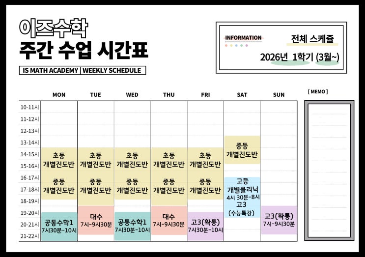 대방동 수학학원 이즈수학-2026년 1학기 주간 시간표