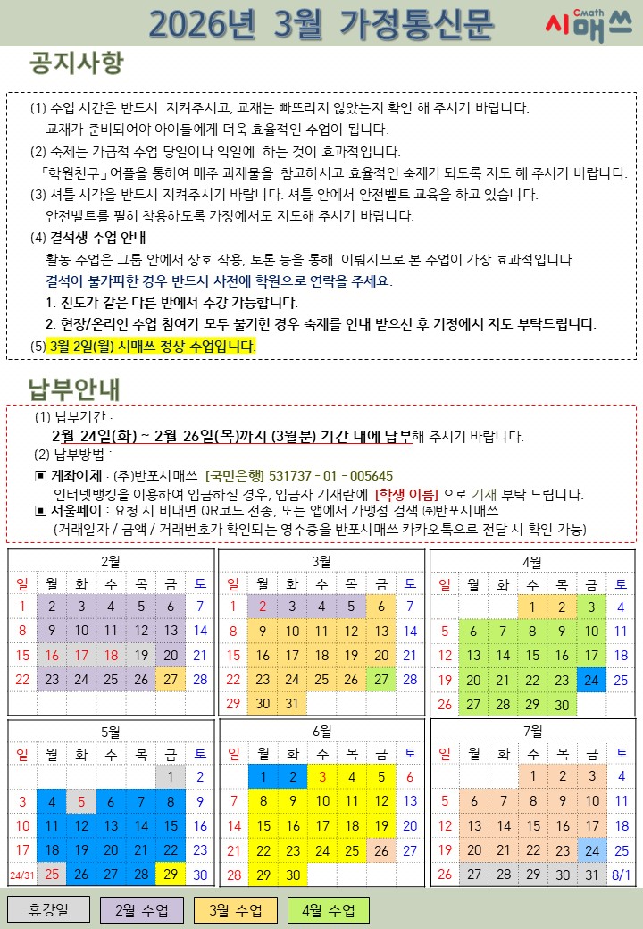 안녕하세요. 반포시매쓰입니다. 2026년 3월 가정통신문을 아래와 같이 공지하오니 수업일정 및 교육비 납입기간 확인하시어 기간 내 납부 부탁드리겠습니다. 3월2일(월) 시매쓰 정상 수업입니다. 결석시 학원으로 미리 말씀부탁드립니다.^^ <img src="https://blogthumb.pstatic.net/MjAyNjAyMjRfMTM3/MDAxNzcxOTA0NDU4MTc3.CfgLonGgT7YBQ7OfXr2OhzDx61Q0PIQHK0djIoU1Xk4g.XjfpzcGzOUtUa4m6IL8mF7VigzA33ohS3pTR6muXLBMg.JPEG/3%BF%F9_%B0%A1%C1%A4%C5%EB%BD%C5%B9%AE.jpg?type=s3" />