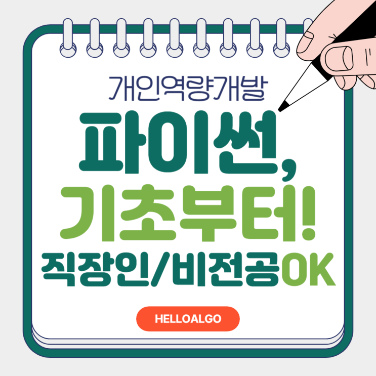 안녕하세요 SW인재육성, 헬로알고입니다. AI에 대한 관심, 개발자 진로에 대한 고민 등 코딩은 더이상 전공자만 배우지 않습니다. 최근 대학생, 직장인들 사이에서도 파이썬을 배우려는 분들이 늘어나고 있습니다. 그래서 헬로알고를 통해, 성인도 배울 수 있는 지에 대해 문의 주시는 분들도 많은데요 왜 파이썬을 배우려고 하는걸까? 요즘 많은 대학에서 파이썬 기초를 필수과목으로 지정하고 있습니다. 관련 전공자가 아니어도 데이터 분석 수업을 위해 파이썬을 배우는 경우가 있습니다. IT 비전공자라도 코딩을 할 줄 안다면 데이터 분석, AI 등 활용성이 무궁무진! 데이터를 다루는 능력이 확실히 레벨업이 되죠. 또한 IT계열 회사에 지원....... <img src="https://blogthumb.pstatic.net/MjAyNjAyMjFfMjky/MDAxNzcxNjM0NTE1MjMy.8T4AKIHa1fLaEsJ3bY_ikT_LllSS7NMmPz_PRj9URxwg.LR5WVrrsfjA0ysHxyx6d0Lghwt9_FqboJ_y6W32lxhMg.PNG/0329-004.png?type=s3" />