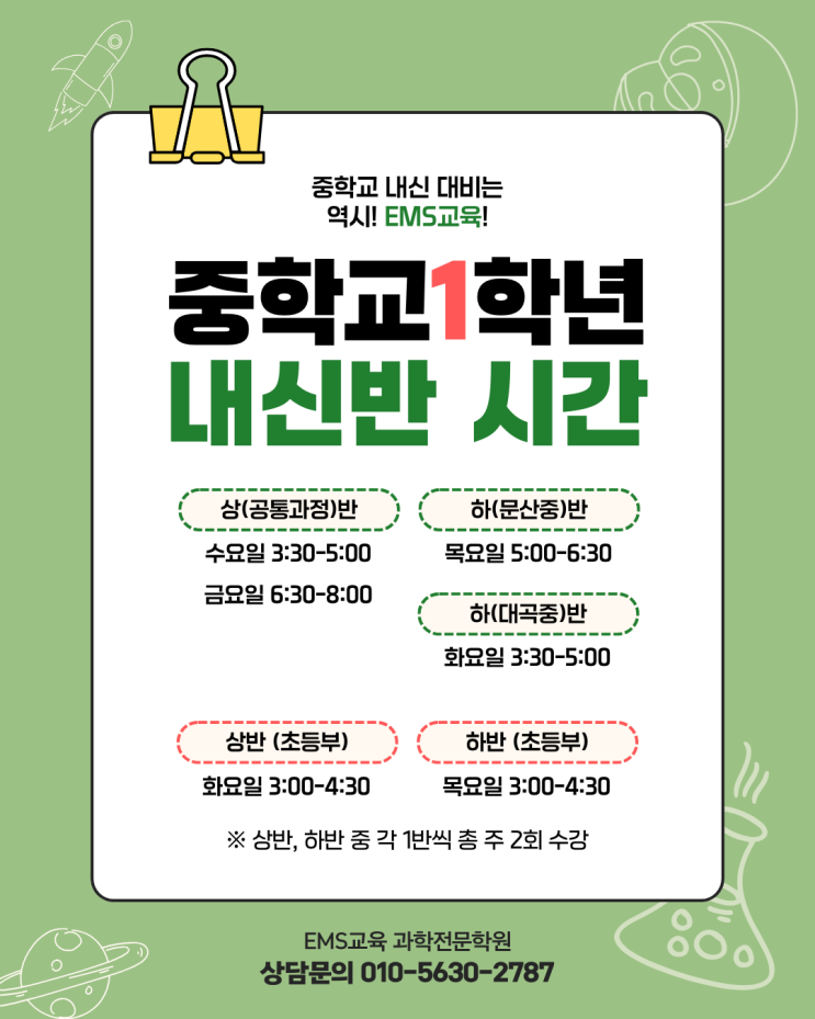 안녕하세요, 진주 혁신도시 충무공동에 위치한 이엠에스학원(EMS교육 과학전문학원)입니다. 중학교 1학년 과정을 공부하고 싶은 중학교 1학년, 초등학교 6학년 학생들을 모집합니다. 인생 첫 시험도 EMS교육과 함께 꼼꼼하게 준비하자! 중학교 1학년 학생 상(공통과정)반 수요일 3:30-5:00 금요일 6:30-8:00 하(문산중)반 목요일 5:00-6:30 하(대곡중)반 화요일 3:30-5:00 문산중 학생일 경우 상반 중 택1, 하반 목 5:00-6:30 총 주 2회 수강 대곡중 학생일 경우 상반 중 택1, 하반 화 3:30-5:00 총 주 2회 수강 주 2회 수강해야 전 과정 학습이 가능합니다. 초등학교 6학년 상반: 화 3:00-4:30 하반: 목 3:00-4:30 총 주 2회 수강 ※ 상담문의: ....... <img src="https://blogthumb.pstatic.net/MjAyNjAyMjFfMjAw/MDAxNzcxNjUzMzk4MjQ0._o_dBsRoOiQT6Z4P8g9kmSWc2I-t1gSb1p66jDqpowMg.lfBEPDR7gEwpGVDghDaw9oP8nIaCj3SxfA7_KQ03WpEg.PNG/%EC%A4%3F1_%3F%8B%9C%EA%B0%84%ED%91%9C_26_%281%29.png?type=s3" />