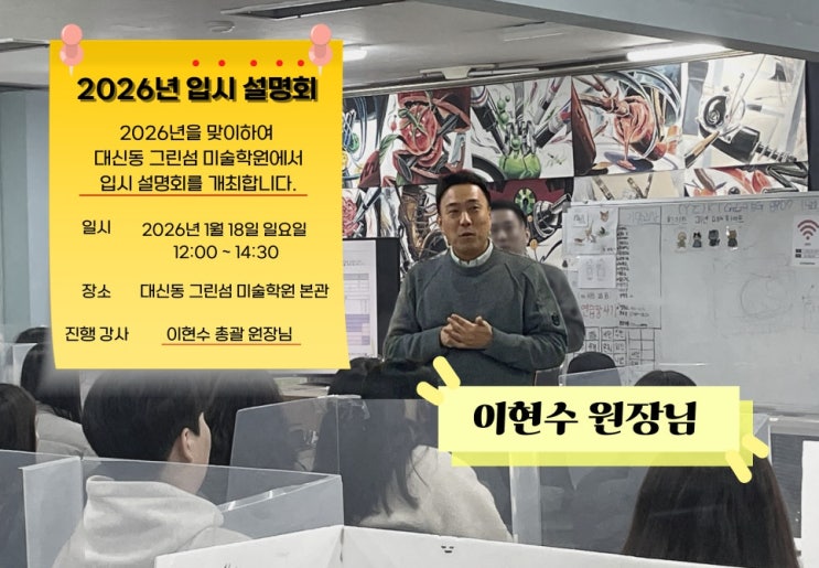 안녕하세요~ 통영 로고스 미술학원입니다! 오늘은 저희 로고스미술학원의 연계학원인 그린섬미술학원과 함께하는 입시설명회에 대해 안내해 드립니다~~^^ 026 입시, 로고스에서 가장 먼저 시작합니다! 이번 주 일요일, 2027학년도 입시를 대비한 설명회를 로고스와 그린섬이 함께 진행합니다. 고3 학생과 학부모님을 대상으로 진행되는 이번 성명회는 2026입시 흐름을 정확히 짚고, 지금 시점에서 무엇을 준비해야 하는지 명확한 방향을 제시하는 자리입니다. ● 2026년 입시 설명회 안내 ● 일시: 2026년 1월 18일 일요일 12:00 ~ 14:30 ※ 11:50까지 착석 부탁드립니다. 대상: 고3 입시생 · 학부모 이번 설명회는 그린섬 총괄 원장님께서 직접....... <img src="https://blogthumb.pstatic.net/MjAyNjAxMTVfNzAg/MDAxNzY4NDc1MTYzNjg3.FZzAlXeNfjXPJ5fWLx5V8-ZgHamWt7AzlBrYl4Uk88sg._nA5K91sWrkaj1SFcK0LQrLfkZB7_z5W7xYVCifeqZIg.JPEG/2026%C0%D4%BD%C3%BC%B3%B8%ED%C8%B8-001.jpg?type=s3" />