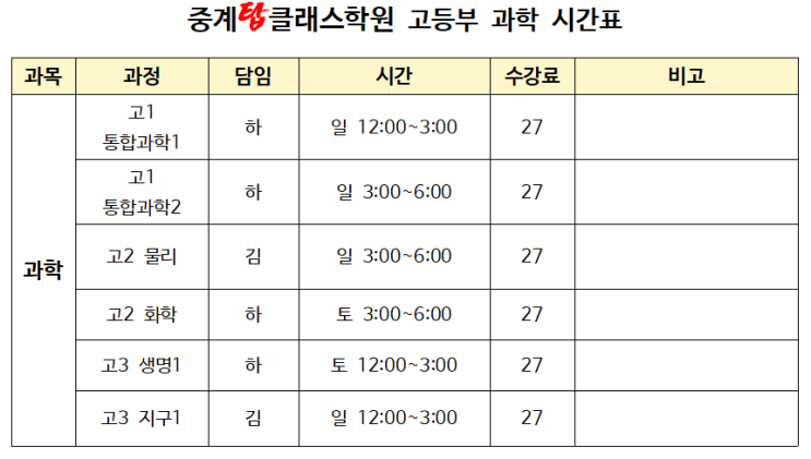 안녕하세요. 중계동 은행사거리에 위치한 고등부 과학 단과 학원입니다. 중계탑클래스학원에서는 중고등부 국어, 영어, 수학, 과학 단과 수업이 소수 정예로 진행되고 있습니다. 국어와 영어 모두 학교별 내신대비 수업으로 진행됩니다. 최대정원은 5명, 일부수업은 7명 정원입니다. 어제부터 최강한파가 밀려오고 있습니다. 내일은 더 춥다고 하네요. 각별히 건강 유의하시길 바랍니다. 오늘은 고등부 과학 수업에 대해 안내드리려고 합니다. 고3 수능대비 수업으로 지구과학1 과 생명과학1 수업이 개설되었습니다. 최대정원은 5명으로 한정되는 수업으로 27년도 수능을 향해 나아갑니다. 27년 수능을 준비하는 고3 학생들의 많은 수강신청 바랍....... <img src="https://blogthumb.pstatic.net/MjAyNjAxMjFfMTU5/MDAxNzY4OTk2MDIwNjkz.qyLMFnKUlesacBh50RFfLTQTylmuX1d5cafuvyv0ENIg.fA5Ssz3ha9zQspleMDcItE4914bENlKDhF4M1axThW4g.PNG/%C1%DF%B0%E8%B5%BF%BC%D2%BC%F6%C1%A4%BF%B9%B0%FA%C7%D0%C7%D0%BF%F8.png?type=s3" />