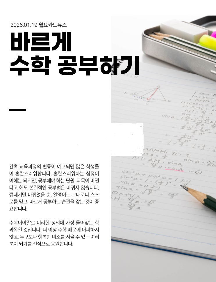 교육과정이 바뀐다는 이야기가 들리면 많은 학생들이 먼저 불안해합니다. “지금까지 공부한 게 의미 없어지는 건 아닐까?” “앞으로 뭘 어떻게 해야 하지?” 그 마음, 충분히 이해합니다. 하지만 한 가지 분명한 사실이 있습니다. 공부해야 할 단원과 이름은 바뀔 수 있어도, 공부의 본질은 변하지 않습니다. 겉모습만 달라졌을 뿐 수학이 요구하는 사고력과 이해의 깊이는 그대로입니다. 그래서 무엇보다 중요한 건 유행하는 공부법이 아니라 바르게 공부하는 습관입니다. 수학은 특히 그렇습니다. 개념을 대충 넘기고 요령만 익히면 어느 순간 반드시 벽을 만나게 됩니다. 기초는 쉬워서 기초가 아니라, 중요해서 기초입니다 기초는 빨....... <img src="https://blogthumb.pstatic.net/MjAyNjAxMjNfMTkz/MDAxNzY5MTU5OTkxNDY1.-jRRf42oF59KPTNpAaJdbDxzo9cPei0akXLeYjYG1Ggg.uVXxS0tBcJtt0kx4eWcEG5YJlbn2L8gdg5qaGG3_eAwg.JPEG/260119_%BF%F9%BF%E4_%C4%AB%B5%E5%B4%BA%BD%BA1.jpg?type=s3" />