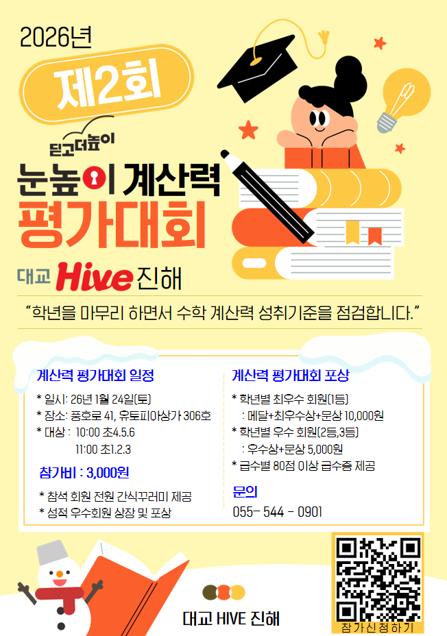 안녕하세요! 눈높이 로즈빌 학습관입니다! 수학의 가장 기본이 되는 것은 뭐다?! 연산이다! 눈높이 로즈빌/웅천 학습관에서는 아이들의 연산력을 UP! 시키기 위해서 개별진도로 맞춤학습을 진행중인데요! 지난 주 토요일, 진해교육국에서 진행하는 " 계산력 평가 대회"에 우리 눈높이 로즈빌 공부방 친구들이 출전하였습니다!! 시험을 다 치면 뽑기와 맛있는 간식까지! 준비완료! 진지한 분위기속에서 치뤄진 계산력평가대회! 시험 다 치면! 선물받아가세요~~ 20분이라는 시간동안 최선을 다해 문제를 풀었던 눈높이 로즈빌 학습관 친구들에게 박수를 보냅니다!! 눈높이 로즈빌 학습관/눈높이 웅천학습관은 유아부터 중등까지 개별진도....... <img src="https://blogthumb.pstatic.net/MjAyNjAxMjZfODcg/MDAxNzY5NDAzODc2Mzg3.6y1iRbn1RXVfDPfs2GBzP9pGdCURh9V8I_vDqU3uxB4g.2mrg-rzotEJqbIuoaWoGSfsluKaI1oa1Zouuj_r3iBAg.PNG/image.png?type=s3" />
