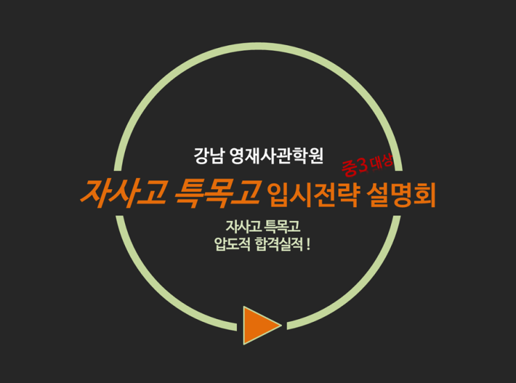 자사고 특목고 입시 전문 강남 영재사관학원입니다. 2026년 중3 학생의 학부모님 대상으로 자사고 특목고 입시전략 설명회가 2월21일(토) 오후 2시에 진행됩니다. 설명회 예약 방법 및 구체적인 일정은 아래의 안내문을 참고하시면 됩니다. 2월에 진행되는 자사고 특목고 입시전략 설명회는 올해 3월 부터 중3이 되는 학생의 학부모님 대상으로 진행됩니다. 12월 설명회가 정원 마감되어 참석하지 못하셨던 학부모님 대상의 설명회로, 12월 설명회에 참석하신 학부모님은 참석이 불가능합니다. 자사고는 외대부고, 하나고, 민사고, 상산고 등을 중심으로 설명이 진행되며, 특목고의 경우 대원, 한영, 명덕 등 외고, 그리고 서울국제고 등 국제고....... <img src="https://blogthumb.pstatic.net/MjAyNjAxMjdfMTky/MDAxNzY5NDk2NjA0MTkz.4mq43eMkolB9CbdmJzr2xdP-n9gPWaiSK61tAn9OMEkg.WEIukfcKyVJfDCv_a7BEGnqACWY-ct12jDsCBA691swg.PNG/image.png?type=s3" />