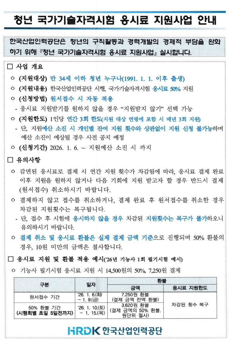 2026년 청년 국가기술자격시험 응시료 지원사업 안내