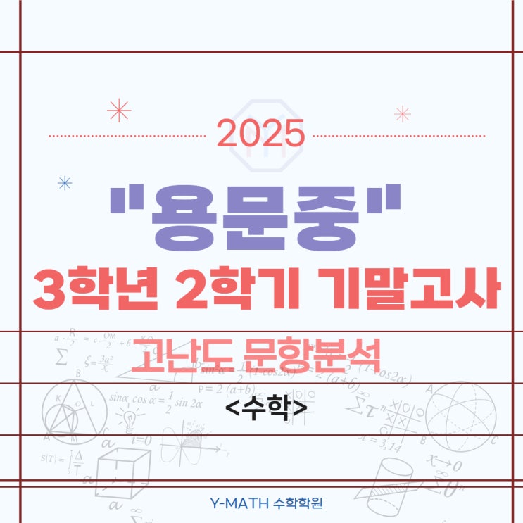 #용문중3 #용문중학교3학년 안녕하세요! 와이매쓰수학학원입니다. 새해가 지난지도 어느덧 일주일이 넘었네요. 새해다짐은 잘 지키고 있나요? 선생님은 살을 빼야겠다... 라고 다짐했는데 벌써 어긴것 같네요 ㅎㅎ; 여러분은 작심삼일되지 않게 늘 다짐을 되새겨 보세요! 오늘은 용문중 3학년 2학기 기말고사를 분석해보고자 해요. 물론, 3학년 2학기 기말고사가 끝난지는 꽤 오래됐지만, 이 글을 보고 있을 올해 3학년들! 올해 3학년들은 꼭 참고해야겠지요? 총 평 용문중 2025년 3학년 2학기 기말고사의 전반적인 난이도는 다소 어려웠다고 볼 수 있겠습니다. 아무래도 3학년 2학기 전 범위가 시험범위였다보니, 공부하는데 부담이 컸을 것입니....... <img src="https://blogthumb.pstatic.net/MjAyNjAxMTBfMTgy/MDAxNzY4MDQ3ODA3OTE4.AH7NLlA-bPEQbH9c9eEdfmWpaOjrP8UOI2lKiO2Io0sg.PEWp2VMD0iZAvdbLry4Bbigr45gEXUxVw6OSb-X0TEgg.JPEG/%BF%EB%B9%AE%C1%DF_3-2_%B1%E2%B8%BB.jpg?type=s3" />
