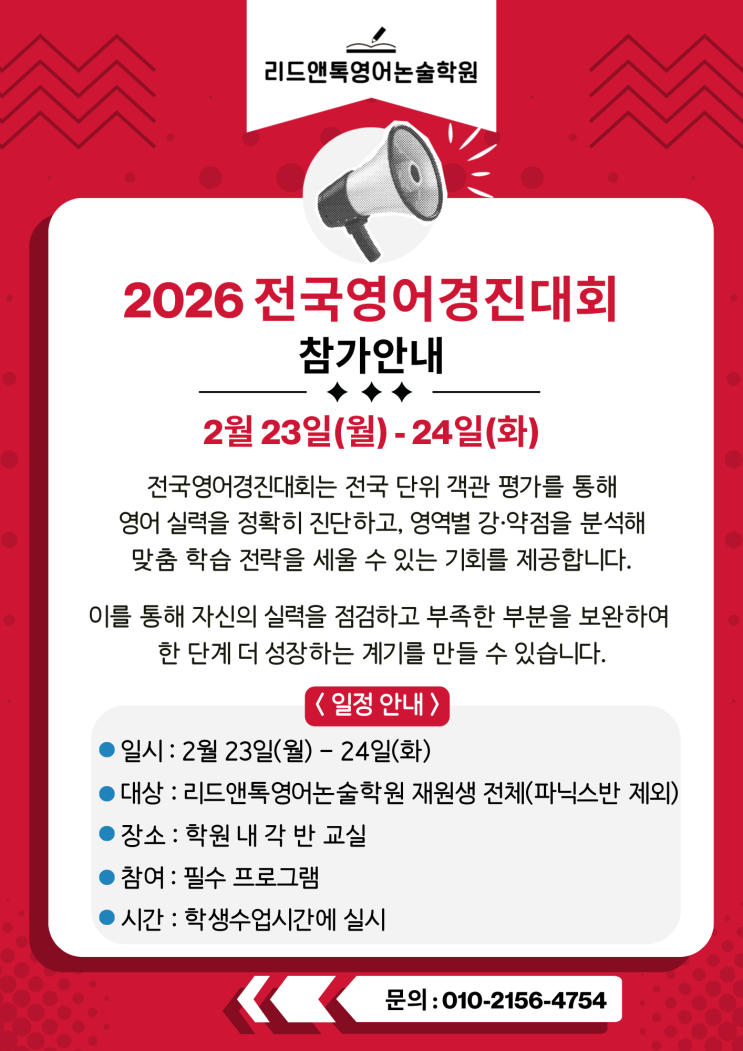 2026 전국영어경진대회 참가 안내 안녕하세요, 리드앤톡영어논술학원입니다! 2026년 새해를 맞아, 우리 아이들의 영어 실력을 객관적으로 점검하고, 맞춤 학습 전략을 세울 수 있는 특별한 기회를 마련했습니다. 그 주인공은 바로 **2026 전국영어경진대회**입니다. 이번 대회는 **전 원생(파닉스반 제외)**이 참여하는 필수 프로그램으로, 단순 시험이 아닌 성장과 학습 전략 수립을 위한 특별한 경험입니다. 전국영어경진대회, 왜 중요할까요? 많은 학부모님께서 공통적으로 하시는 고민이 있습니다. “우리 아이 영어 실력은 지금 어느 정도일까요?” “듣기, 읽기, 쓰기 중 어떤 부분을 강화해야 할까요?” “내년 학습 계획은 어떻게 세워야....... <img src="https://blogthumb.pstatic.net/MjAyNjAyMjBfMjM4/MDAxNzcxNTc1OTY1MTIz.fAXwtVx9Nj8gQVUR6oJaUOEmyILIX1HPnY0QEEtg7Ckg.k5lQOvfwEwr9kxLJVUF8NpQwFPy7KNZwols5RcAWiDcg.PNG/%C0%FC%B1%B9%BF%B5%BE%EE%B0%E6%C1%F8%B4%EB%C8%B8.png?type=s3" />