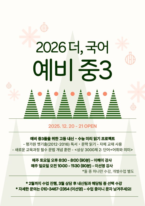 안녕하세요! 더, 국어학원입니다. 오늘은 예비중3을 위한 팀수업 커리큘럼 안내드립니다. 개강일: 12월 20일 토요일, 21일 일요일 예비 중3 학생들을 대상으로 새롭게 개강하여 수업 진행 중에 있으며, 자세한 사항은 위 포스터를 참고 부탁드립니다 팀수업 시간 매주 토요일 오후 6:30 - 8:00 (90분) 매주 일요일 오전 10:00 - 11:30 (90분) * 개별 수업 시간은 학생별 상의 후 결정합니다. * 선착순 등록으로, 조기 마감될 수 있습니다. <처음 시작하는 밥 먹듯이 매일매일 비문학 독서 > <상상내공 수능 내신 필수 국어 문법 3000제 2 : 단어+어휘와 의미> 예비 중3 팀수업에서 사용하고 있는 교재입니다. 현재 예비중3 팀수....... <img src="https://blogthumb.pstatic.net/MjAyNjAxMDNfNjMg/MDAxNzY3Mzc0ODQ5NTIz.q-hFPynHwylm27W_nuwN-nmkrGm5Cdvy2C3mV8ppqKog.qh0D7r2HPavod9E_rMa10iWGUrE-UhisURNJfh2vVC8g.JPEG/KakaoTalk_20251231_170213104.jpg?type=s3" />