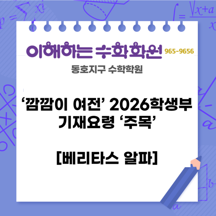 2026 고1 영어반 모집 소수정예 · 원장 직강 · 내신 & 수능 완벽 대비 왜 고1 영어가 중요한가요? 고등학교 1학년은 ✔ 학교별 내신 출제 경향이 본격적으로 시작되고 ✔ 모의고사 유형이 수능과 직접 연결되며 ✔ 어휘·구문·독해 체계가 완성되는 시기입니다. 이 시기를 어떻게 보내느냐에 따라 고2, 고3의 성적 곡선이 완전히 달라집니다. ✔ 소수정예 수업 한 명 한 명의 약점 정확히 분석 개별 첨삭 및 오답 피드백 수업 참여도와 집중도 극대화 성적 변화 과정을 직접 관리 “많이 듣는 수업”이 아니라 제대로 이해하는 수업을 합니다. ✔ 원장 직강 시스템 20년 이상 지도 경험을 바탕으로 ✔ 학교별 내신 기출 분석 ✔ 모의고사.......