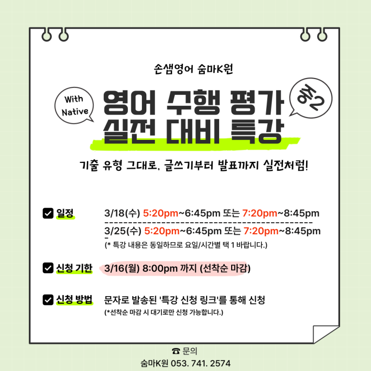 안녕하세요 숨마원 친구들 !^)))))^ 예비중2 친구들을 위하여 1학기 수행평가 실전 대비 특강을 진행할 예정이에요. 자세한 사항은 아래의 안내문을 읽고 많은 신청 바랍니다~~~ !!! <img src="https://blogthumb.pstatic.net/MjAyNjAyMjdfMjkw/MDAxNzcyMTgzOTg2OTg5.hk1K3pKhqP1I2XcW78FkV01cf-5xndeehQbAsfw1Tr4g.YwsM2rHt6PgweOD2zPjwrElKt22QQojICyYhgOTu0NQg.PNG/%C1%A6%B8%F1%C0%BB-%C0%D4%B7%C2%C7%D8%C1%D6%BC%BC%BF%E4_-006.png?type=s3" />