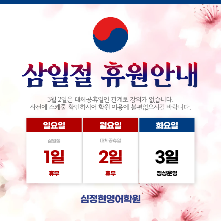 삼일절 공휴일 관계로 3/2(월) 대체공휴일 수업이 없습니다. 3/3(화)부터 정상운영합니다. 스케줄 참고하시어 이용에 불편 없으시길 바랍니다. 감사합니다:) <img src="https://blogthumb.pstatic.net/MjAyNjAyMTFfMTY2/MDAxNzcwNzQyNTAyMzIy.vipRE7uhE7uh8Wg5h3-8WNaGwfZ34GZb7eZ1fwYnlZ0g.4-otfFvfii0bSsVSPIyR5Znrwdfsthdwlq2j32KBt7Eg.PNG/2026_%BB%EF%C0%CF%C0%FD%C8%DE%BF%F8%BE%C8%B3%BB.png?type=s3" />