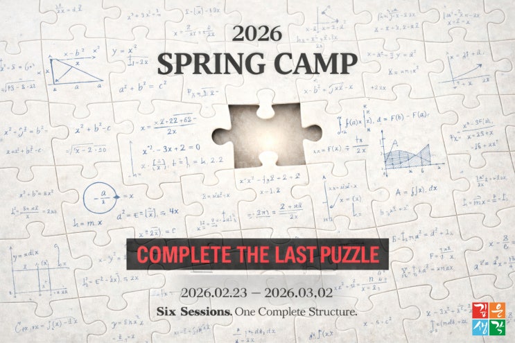 SPRING CAMP for 중1 지금, 마지막 퍼즐을 맞출 시간! 중학교 첫 시험은 단순한 시험이 아니라 성적 구조가 처음 만들어지는 시기입니다. 이 시기에 기본 구조가 흔들리면 이후 시험에서도 같은 실수가 반복됩니다. 특히 중학교 내신은 B 하나만으로도 성적표의 분위기가 완전히 달라집니다. 지금의 성적은 그대로 고등학교 진학 과정까지 이어지기 때문에 첫 시험의 결과는 생각보다 큰 영향을 남깁니다. 2026 Spring Camp는 중간고사 전 범위를 기준으로 최고난도 문제 중심의 실전 훈련을 진행하는 과정입니다. 일품·블랙라벨·N제 블랙의 최고난도 문항과 학교 기출문제를 중심으로 실제 시험에서 필요한 해결 구조를 만들어갑니다. 3월부터는....... <img src="https://blogthumb.pstatic.net/MjAyNjAyMTJfMjU1/MDAxNzcwODMyNzg3NDAw.Gjv9XDyM9cra0DK0M05YXELOGTgZAy8yDzjJht2pLw4g.Hfh_2eOHDAl2D7cPwnPl8dvi5FfERJCRDAWf9wNS4Bwg.JPEG/%C1%A6%B8%F1%C0%BB_%C0%D4%B7%C2%C7%D8%C1%D6%BC%BC%BF%E4..jpg?type=s3" />