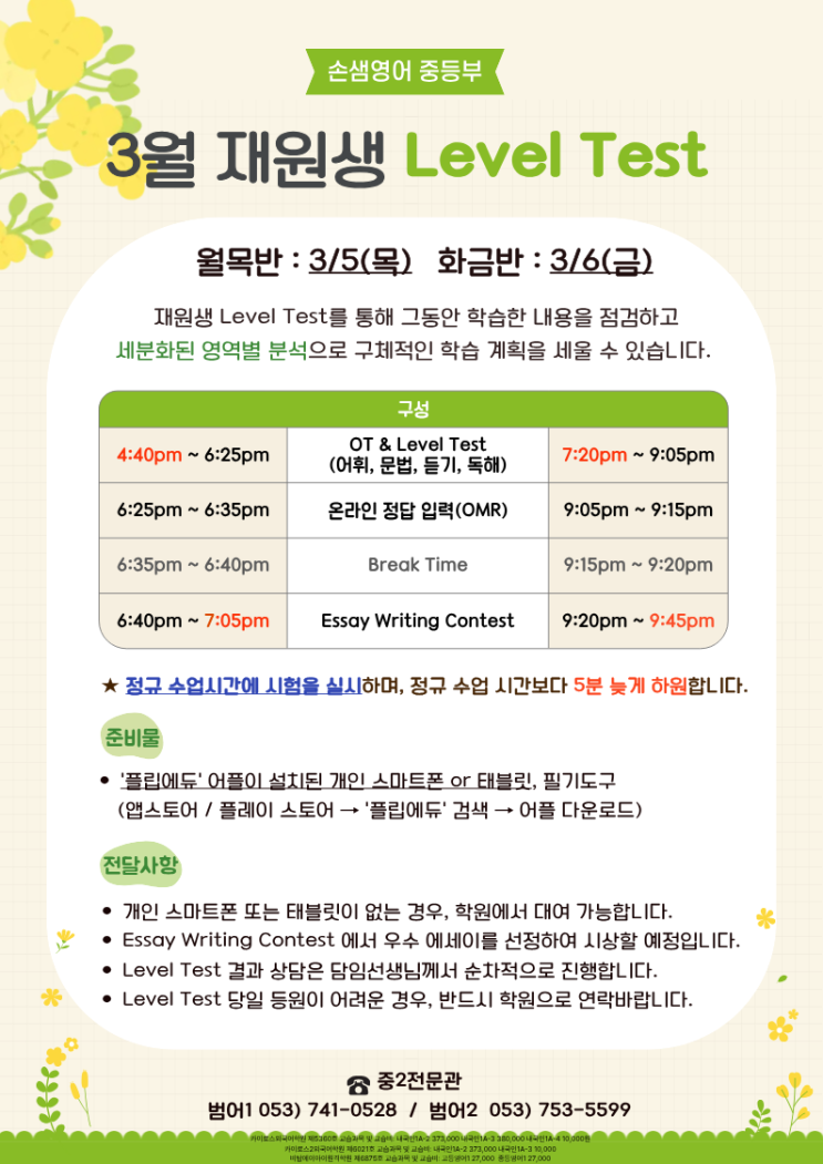 [손샘영어] 중2 전문관 3월 재원생 Level Test 안내문